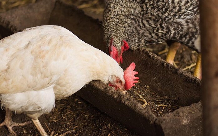 Naplňte krmítko pre sliepky kvalitným krmivom